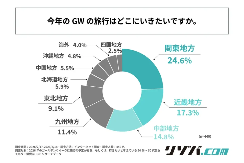 「2026年のGWの旅行はどこに行きたいか」という設問に対する回答では、1位が「関東地方」で24.6%、2位が「近畿地方」で17.3%、3位が「中部地方」で14.8%となりました。約4人に1人が関東地方を旅行先として挙げています。
