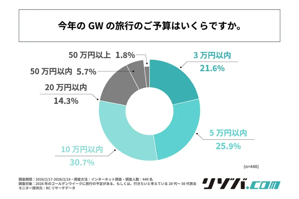 また、「2026年のGWの旅行の予算」は、1位「10万円以内」が30.7%、2位「5万円以内」が25.9%、3位「3万円以内」が21.6%となり、10万円以内で計画する人が最多となっています。